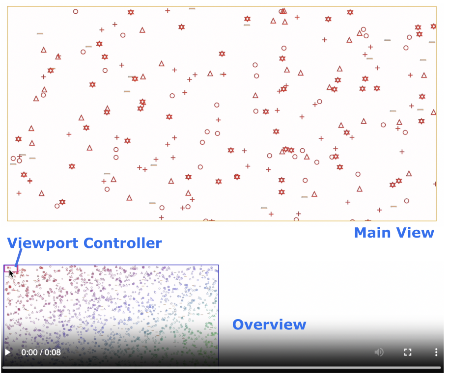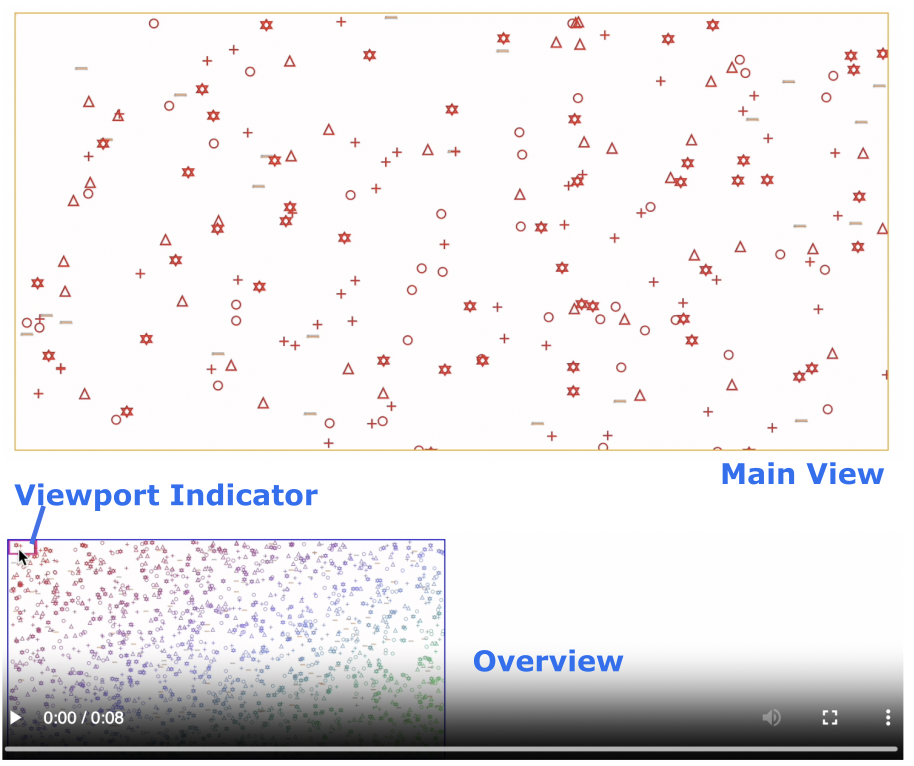Infinite Canvas views are used in conjunction with an "overview" that has a Viewport Indicator. The Viewport Indicator shows which portion of the main scene is visible so that users maintain their spatial orientation.
